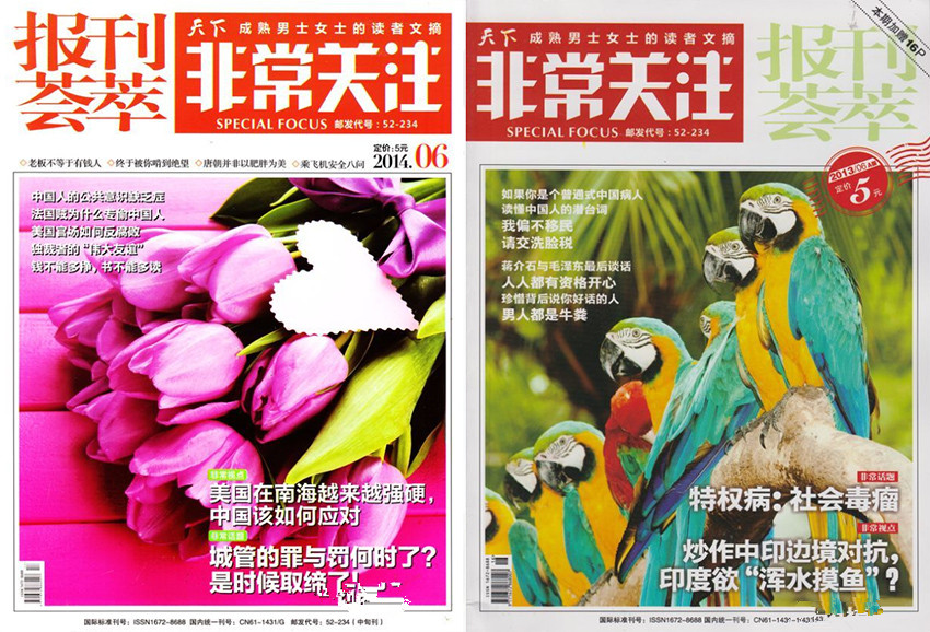 《非常關(guān)注》是主要面向中青年男士女士的高品位的文摘刊物。非常視野、非常悅讀、非常真善美,關(guān)注社會(huì)、關(guān)注人生、關(guān)注天下事。既有當(dāng)今時(shí)政熱點(diǎn)、又有家長(zhǎng)里短;既有嚴(yán)肅的社會(huì)問(wèn)題,又有輕松地中外逸事;既放眼看世界,有追古問(wèn)今。
