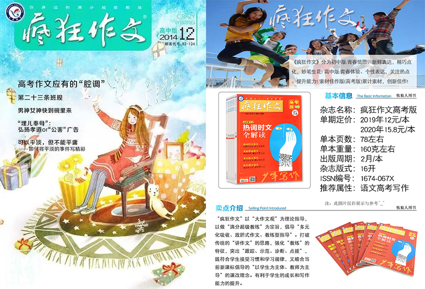 《瘋狂作文》雜志是一本專注于提升作文寫作能力的教育類雜志。該雜志始創(chuàng)于2008年,由一群熱衷于教育事業(yè)的專業(yè)作家、教育家和編輯共同創(chuàng)辦。目前,《瘋狂作文》已經(jīng)成為廣大學(xué)生和家長喜愛的品牌教材。