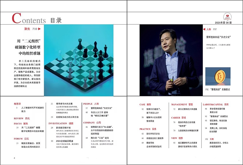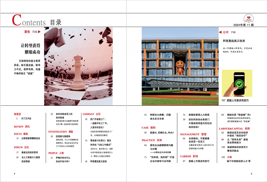 雜志以“前沿性、實用性、數據化”為核心,設置八大核心欄目:卷首語:由頂尖專家或企業領袖撰寫,聚焦行業趨勢與戰略思考。聚焦:深度解析政策法規、技術變革對人力資源的影響。論壇:邀請學者、企業家探討組織轉型、跨文化管理等熱點議題。資訊:實時追蹤全球人力資源管理動態,提供政策解讀與案例速遞。調查:聯合權威機構發布薪酬福利、員工滿意度等量化研究報告。案例:剖析標桿企業如華為、中興的實踐,提煉可復制的管理工具。人物:訪談HR精英,分享職業成長與團隊管理經驗。公司:展示企業人力資源創新實踐,如靈活用工、AI招聘等。